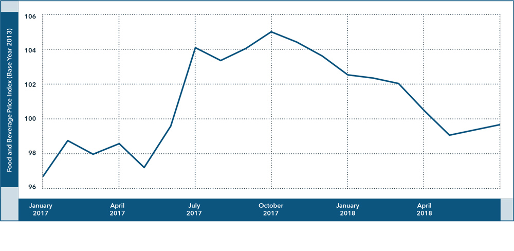 While the long-term consequences of the blockade remain to be seen, Qatar’s strategies appear to have been successful to date. Food prices initially jumped following the blockade but stabilized by the fall of 2017, and by summer of 2018 had fallen almost back to their pre-blockade levels (Figure 5). Overall inflation also remained low. Qatar’s economy grew by 2.1% in 2017 and is projected to grow by 2.6% in 2018.